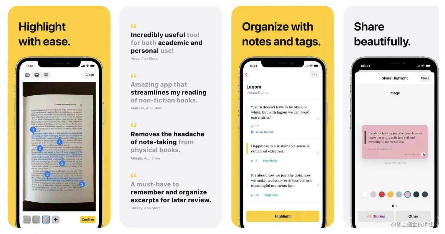 - Highlighted: Book Highlights - 这是一个用来整理摘抄图书笔记的应用,主要功能就是文本识别,句子和段落检测,然后生成一个好看的笔记。功能太简单了。这还可以获得“今日应用”推荐,苹果是真的喜欢这种简单好看的 APP。官网有个简单的介绍可以看看。