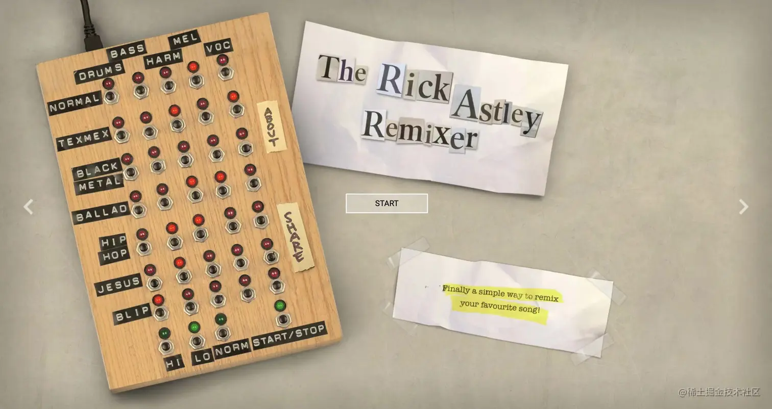 - The Rick Astley Remixer - 这个网站做的非常有创意,可让你重新混音 Rick Astley 的“Never Going To Give You Up”,点击“About”按钮可以看到混音盒子里面的结构,创意十足。