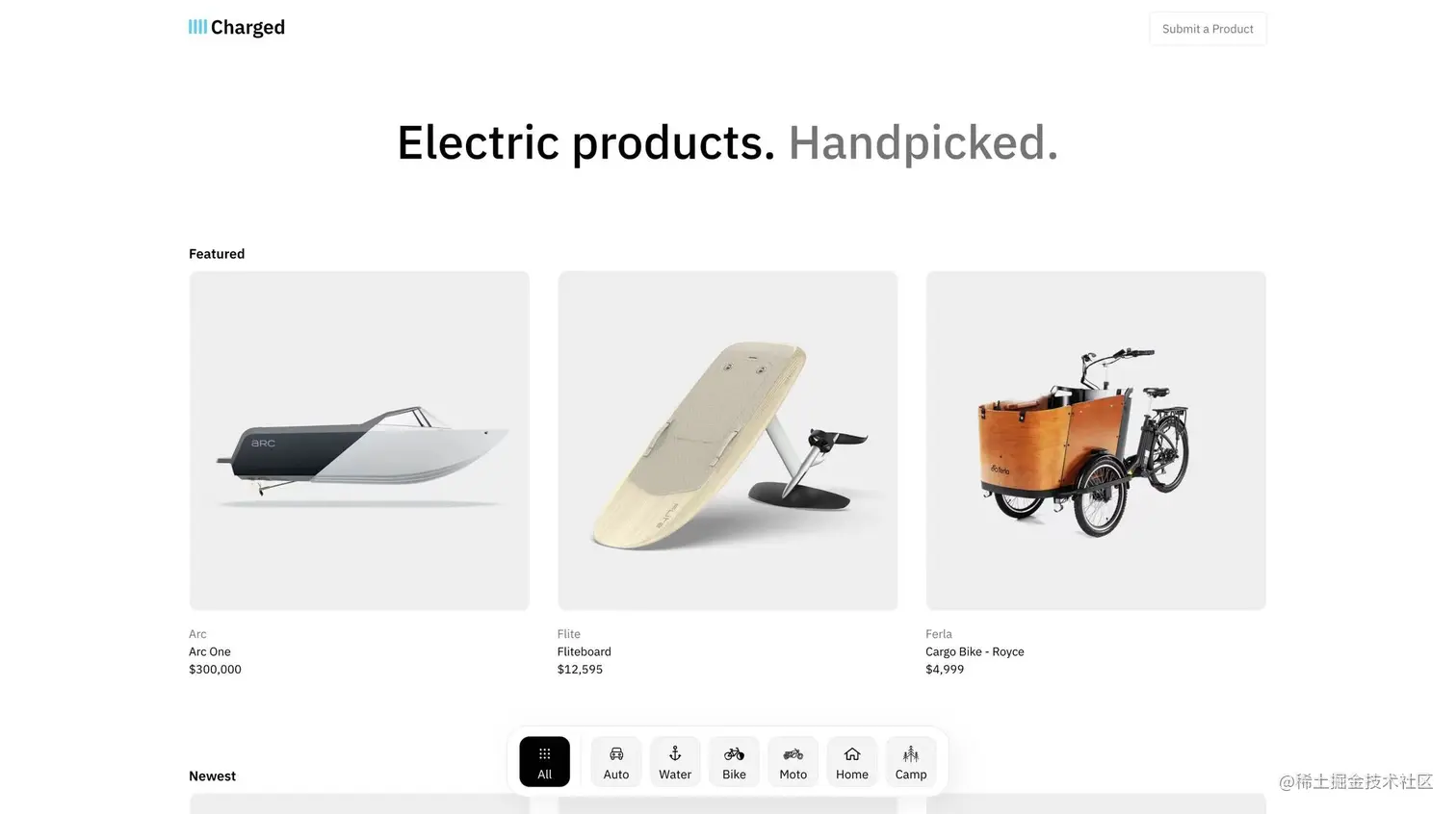 - Charged - 这个网站收集一些很有设计感的电动产品,新能源时代的好物推荐。网站做的很清爽,底部导航非常好看。