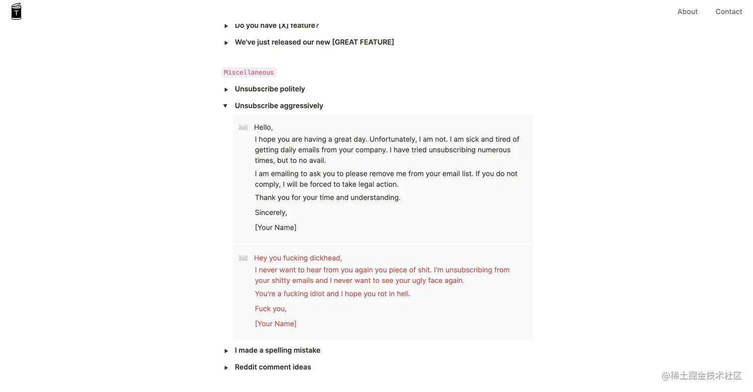 - Cannedtxt - 这是一个回复别人消息的示例参考网站。收集了非常多生活和工作中遇到各种业务情况下回复消息的例子,网站是基于 Notion 数据库构建。有时候不知道该说什么或如何回答的时候打开这个网站看看。比如下面红色文字是如果你想退订一个邮件,应该怎么写(认真读很有用)。