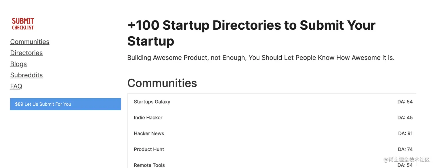 - startup-directory - 这个网站收集了100个推广你的产品的网站。如果你是想在海外刚开始推广你做的产品,可以在这里找找,都是很不错的初始流量来源网站。我之前整理过一个Notion列表《发布推广你的产品》也可以在这里找找。