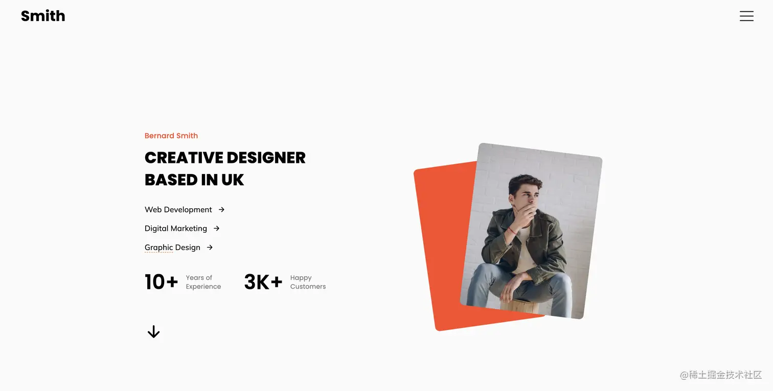 - 用 HTML CSS JavaScript 开发一个个人作品集网站 - 之前推荐过这个开发者,可以看看他的YouTube 频道,日常撸代码。这次的项目也很好看,感兴趣可以看看实现出来的效果:Live Website,开源地址:Github Repo。