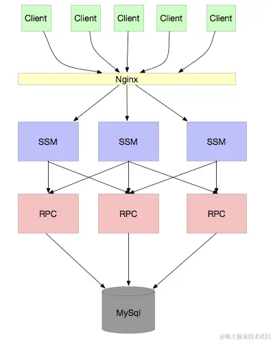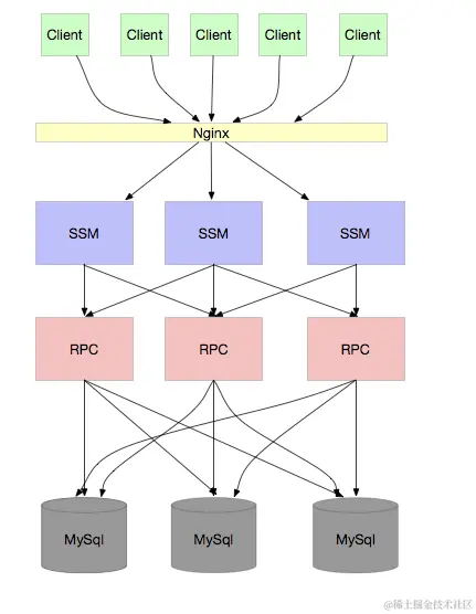 - 单体应用 每个创业公司基本都是从类似 SSM 和 SSH 这种架构起来的,没什么好讲的,基本每个程序员都经历过。