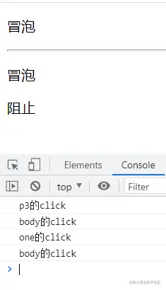 在没有绑定阻止冒泡时,给了body,第一个父元素和第三个子元素绑定处理事件,点击第三个会触发第三个和body的,点击第一个会触发父元素和body的。如果只想触发第三个事件绑定,可将p3的触发函数修改为:传入event,利用event下的 stopPropagation(); 方法。