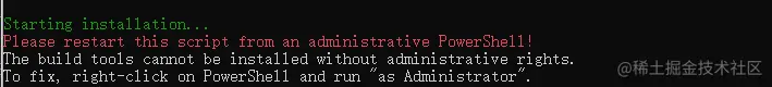 安装windows-build-tools时需要使用【管理员权限的CMD】,不然会提示【Please restart this script from an administrative PowerShell!】