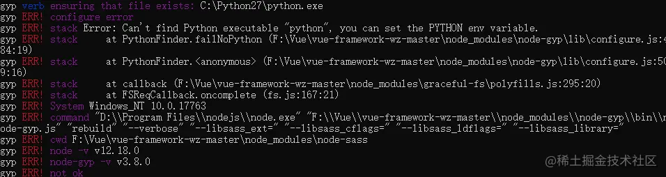 安装完windows-build-tools和node-gyp后,从新运行一个管理员权限的CMD窗口,再从新运行【F:\Vue\vue-framework-wz-master>npm install】初始化项目。