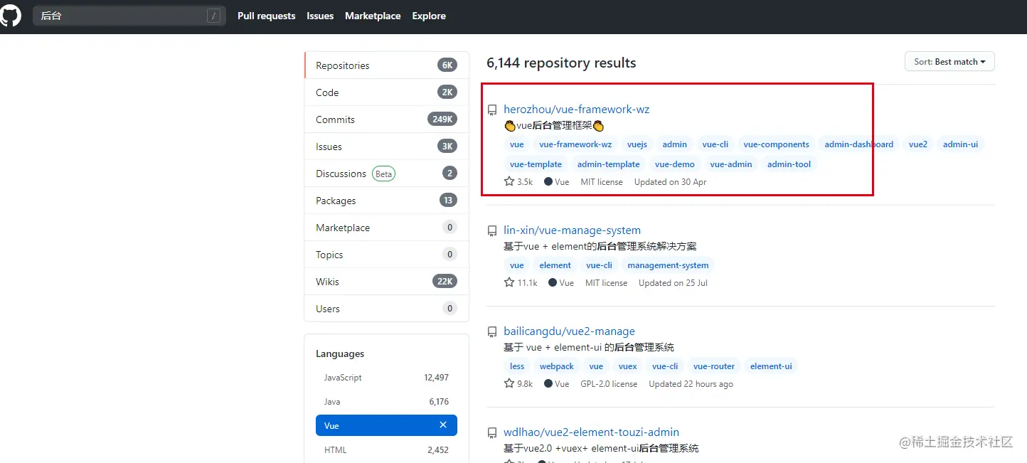 要使用Vue开源项目就必须先找到一个,我们去Github上搜索【后台】,然后使用Vue分类进行检索,找到排名第一的开源框架进行下载—vue-framework-wz