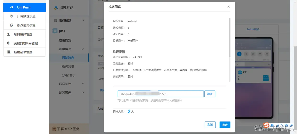 手机安装app并获取cid,并用dcloud平台下的Unipush的通知消息功能测试。