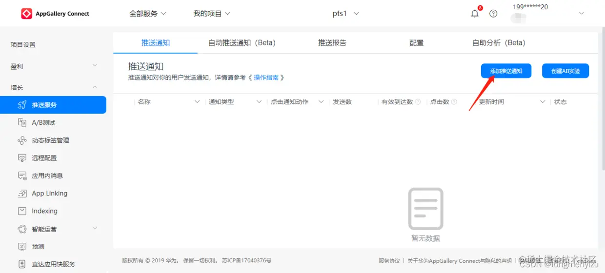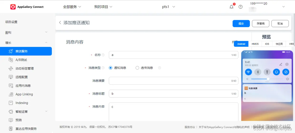 4.在华为开发平台下测试厂商离线发送。手机停止运行app也能收到该推送。