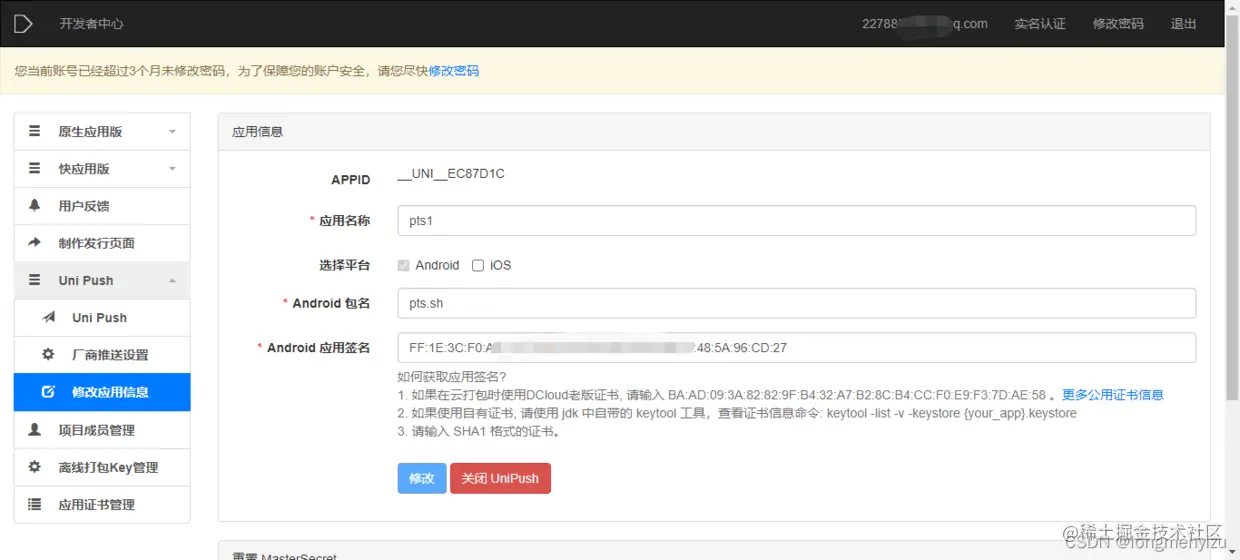 5在dev.dcloud.net.cn的应用信息,填写应用名称、Andriod签名和证书的SHA1(通过查看证书信息得到)