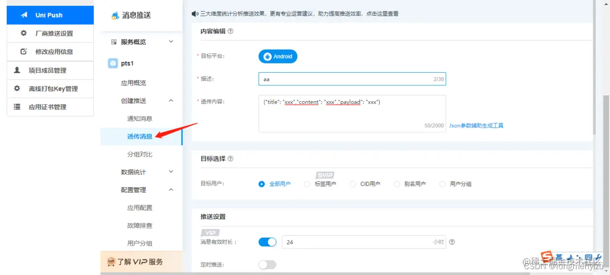 5.在dcloud下测试离线消息发送。注意透传内容格式{"title": "xxx","content": "xxx","payload": "xxx"}和intent:intent:#Intent;launchFlags=0x04000000;action=android.intent.action.oppopush;component=pts.sh/io.dcloud.PandoraEntry;S.UP-OL-SU=true;S.title=xxx;S.content=xxx;S.payload=xxx;end