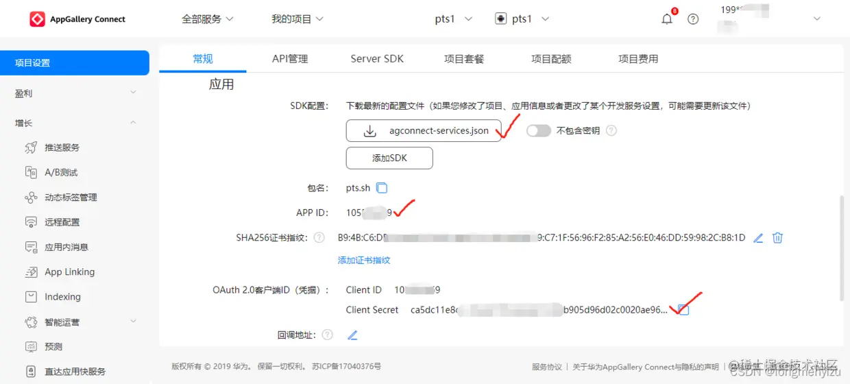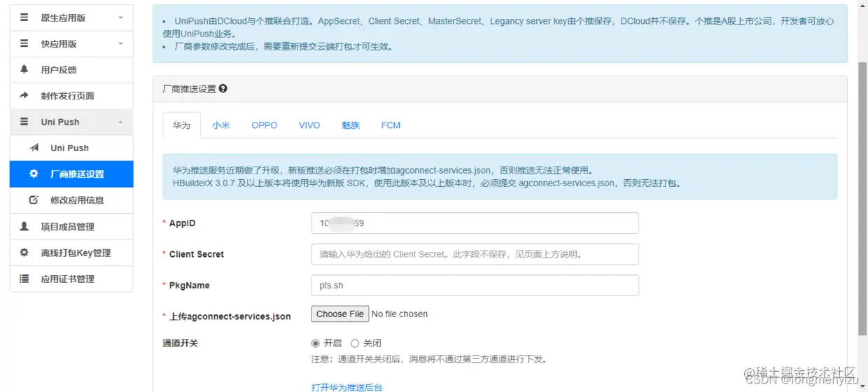 2.配置应用后,将得到的.json文件、APP ID和Client Secret复制并填写到dcloud厂商配置的华为标签下。