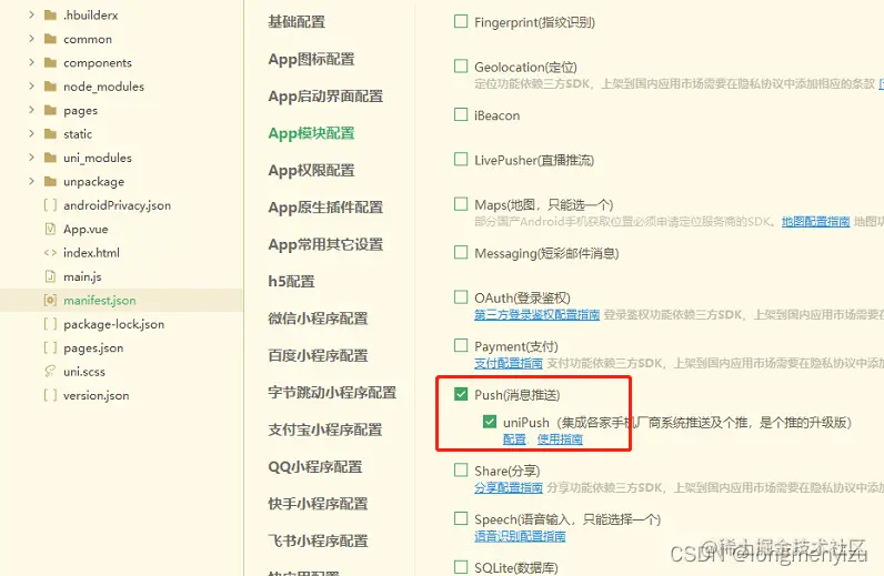 Hbuild下打开PUSH,Unipush功能,并详细阅读"使用指南”。