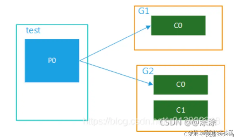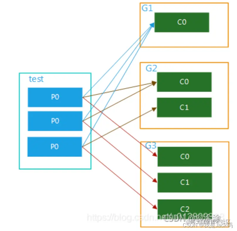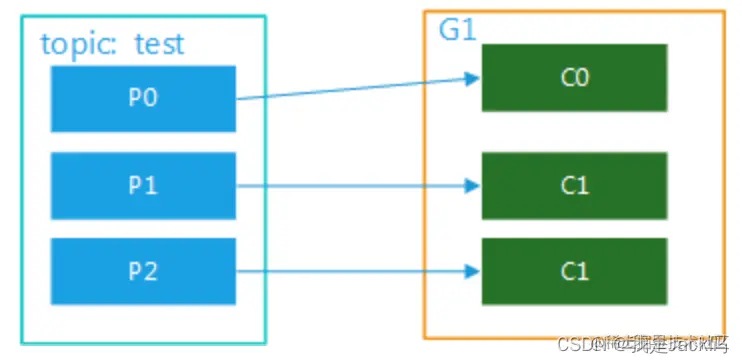 比如test 有3个partition,该组内有2个消费者,那么可能就是C0对应消费p0,p1内的数据,c1对应消费p2的数据;如果有3个消费者,就是一个消费者对应消费一个partition内的数据了。图解分别如图2,图3.这种模式在集群模式下使用是非常普遍的,比如我们可以起3个服务,对应的topic设置3个partiition,这样就可以实现并行消费,大大提高处理消息的效率。