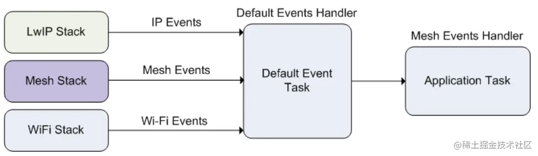 应用程序通过ESP-WIFI-MESH事件与ESP-WIFI-MESH交互。由于ESP-WIFI-MESH构建在Wi-Fi栈之上,因此应用程序也可以通过Wi-Fi事件任务与Wi-Fi驱动交互。下图说明了ESP-WIFI-MESH应用程序中各种系统事件的接口。