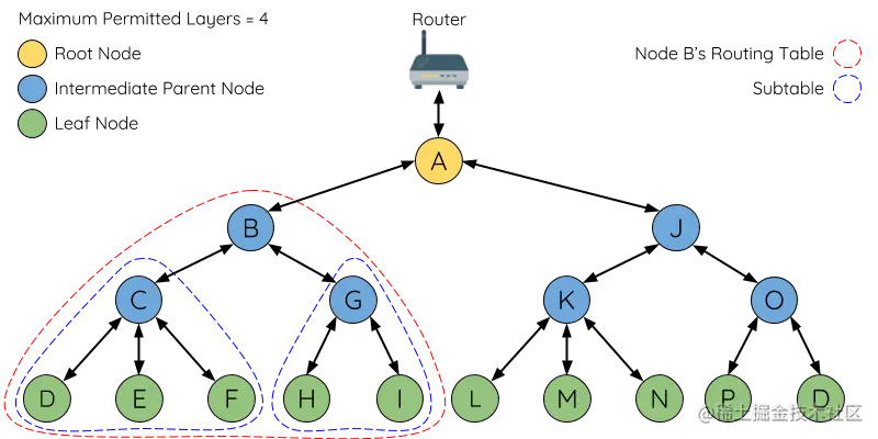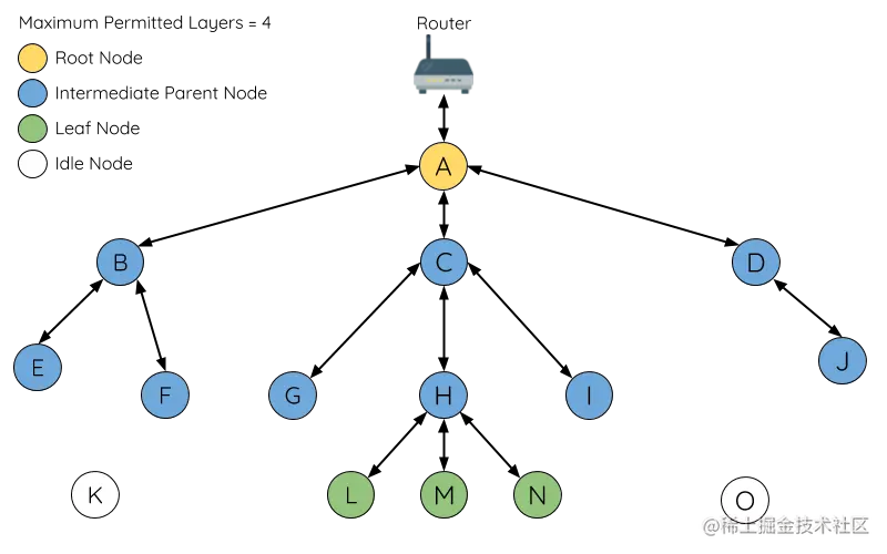 中间父节点: 是指既不是根节点也不是叶节点的连接节点。中间父节点必须有一个上行连接(即一个父节点),但可以有零到多个下行连接(零到多个子节点)。因此,中间父节点可以发送和接收数据包,还可以转发从其上行和下行连接发送的数据包。如上图,节点B到J是中间父节点。**注意,没有下行连接的中间父节点(如节点E/F/G/I/J)不等同于叶节点,因为它们仍然被允许在将来形成下行连接。