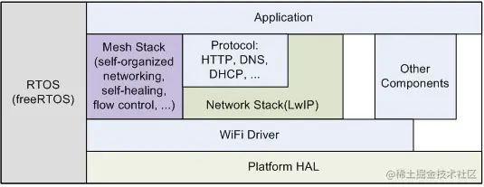 ESP-WIFI-MESH软件栈构建在Wi-Fi驱动程序/FreeRTOS之上,在某些情况下可能会使用LwIP栈(即根节点)。下图说明了ESP-WIFI-MESH软件栈。