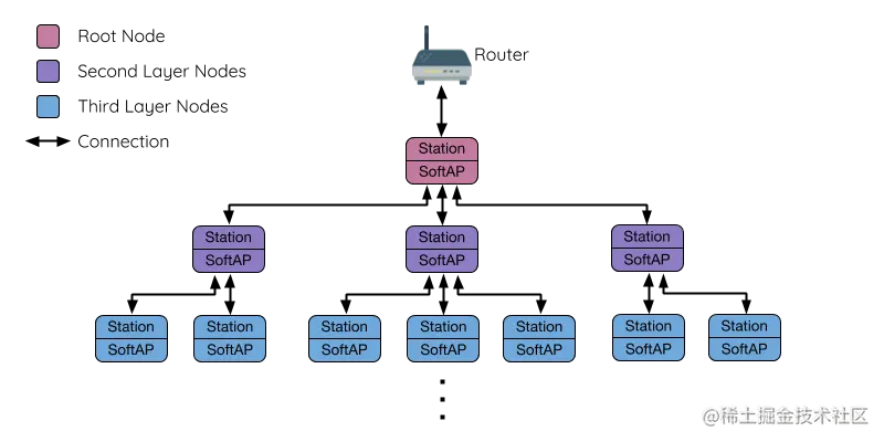 ESP-WIFI-MESH建立在基础设施Wi-Fi协议之上,可以被认为是一种将许多单独的Wi-Fi网络组合成一个WLAN的网络协议。在Wi-Fi中,Station在任何时候都只能与一个AP建立一个连接(上行连接),而一个AP可以同时连接到多个Station(下行连接)。然而,ESP-WIFI-MESH允许节点同时充当Station和AP。因此,ESP-WIFI-MESH中的节点可以使用其SoftAP接口建立多个下行连接,同时使用其Station接口建立一个上行连接。这将自然产生一个由多层父子结构组成的树型网络拓扑结构。