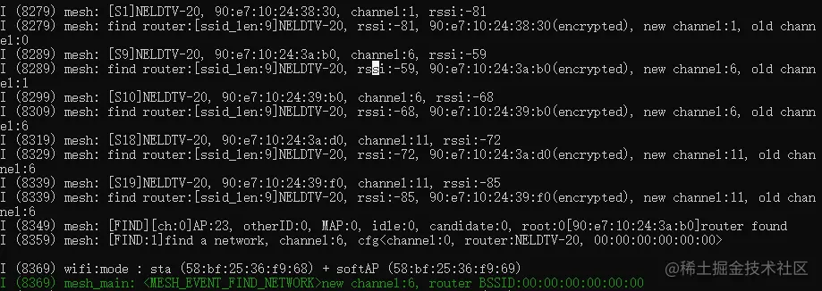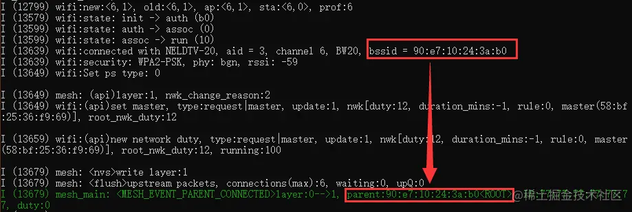 连接到父节点后,打印当前层级的切换情况,父节点MAC地址,和设备在Mesh网络中ID。如果是Mesh网络中的根节点,则开启DHCP客户端获取IP与外网通信。然后创建Mesh网络点对点发送和接收两个任务。
