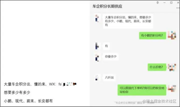 黑灰产通过积分转赠、代下单的方式倒卖非法获取的积分。“积分转赠”就是黑灰产通过社群、电商平台达成交易并付款后,黑灰产将相应的积分通过转赠的方式打入买家对应的账号内。“代下单”就是黑灰产通过社群、电商平台达成交易并付款后,黑灰产用积攒的积分兑换实物礼品,然后收货地址为买家地址。