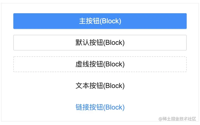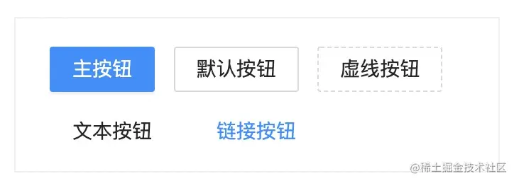 | 操作类型 | 主按钮:用于主行动点,一个操作区域只能有一个主按钮。默认按钮:用于没有主次之分的一组行动点。虚线按钮:常用于添加操作。文本按钮:用于最次级的行动点。链接按钮:一般用于链接,即导航至某位置。 | 主按钮:为按钮添加背景颜色。一般是网站主色调,比如antd的主色调是蓝色,所以主按钮背景设置的蓝色。默认按钮:因为没有主次之分所以没有做额外的设置,标准按钮的样式。鼠标经过的效果为边框和文字高亮,所以鼠标经过时设置边框和文字颜色为蓝色。虚线按钮:虚线边框之前讲过,通过设置边框的格式为dashed实现,即border-style: dashed。鼠标经过的效果为边框和文字高亮,所以鼠标经过时设置边框和文字颜色为蓝色。文本按钮:纯文字展示效果,所以没有设置边框。链接按钮:为了和文本按钮做区分,文字做了高亮处理,文字颜色设置为蓝色。 | |