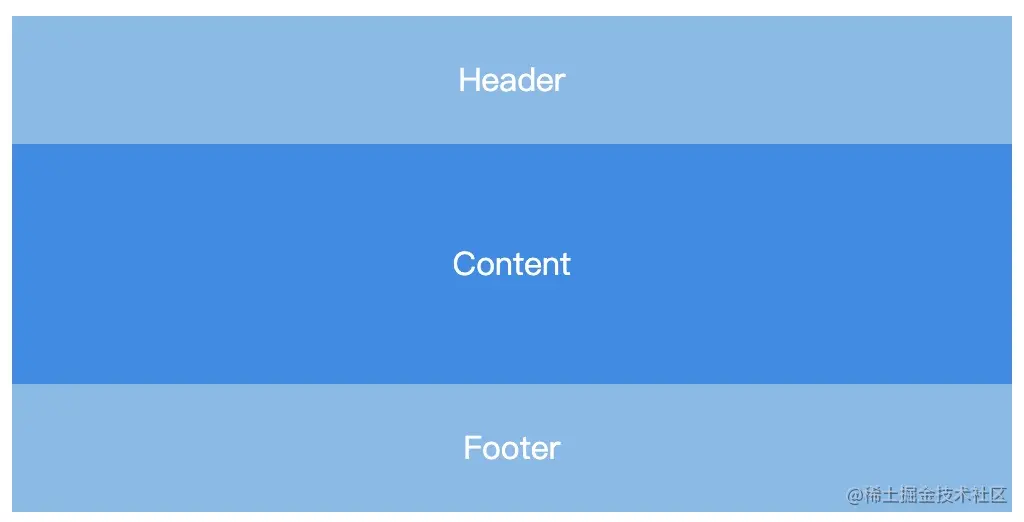 | 上中下布局 | 上:主导航放置于页面的顶端。中:内容放在固定尺寸(例如:1200px)内。下:一些网站信息放到底部。 | 设置flex布局。因为上中下三部分是垂直展示的,所以将父元素flex-direction属性的值设置为column。这样子元素会呈垂直显示。 | |