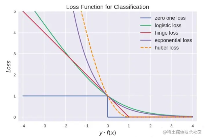 指数损失函数是AdaBoost里使用的损失函数,同样地,它对异常点较为敏感,鲁棒性不够