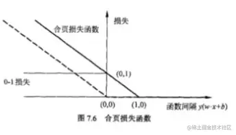 Hinge损失函数是0-1损失函数的一个代理损失函数,也是其紧上界,当 时,不对模型做惩罚。可以看到,hinge损失函数在处不可导,因此不能用梯度下降法对其优化,只能用次梯度下降法。