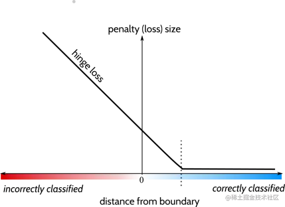 可以看到,当x大于某个值的时候,loss为0,当x小于某个值的时候,那就需要算loss了,说明模型对小于阈值的样本进行了惩罚,而且越大惩罚的越厉害,对于大于阈值的样本不进行惩罚,总的来说就是该损失函数寻找一个边界,对具有可信的样本不惩罚,对不可信的样本或者超出决策边界的样本进行惩罚。