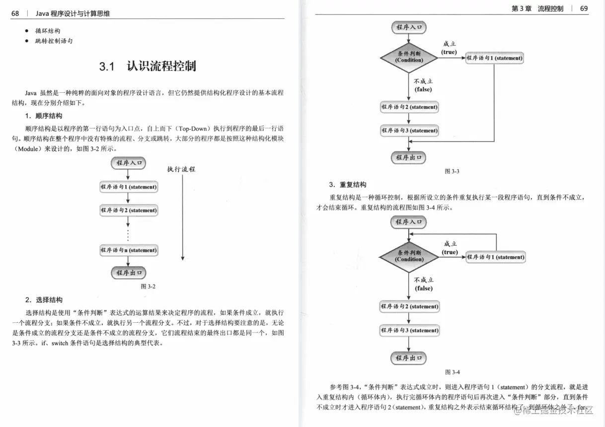 程序执行的顺序并不会像南北直接贯通的高速公路那样,可以从北到南一路通到底,事实上程序执行的顺序可能复杂到像云贵高原的公路,九弯十八转,容易让人晕头转向,因此程序的控制流程就像为公路系统设计的四通八达的通行指示方向,如图3-1所示。Java的流程控制一般是按照程序源代码的顺序自上而下按序执行的,不过有时也会根据需要来改变程序执行的顺序,此时就是通过流程控制语句或指令来告诉计算机应该优先以哪一种顺序来执行程序,程序设计语言中的基本流程控制结构有三种,分别是顺序结构、选择结构和重复结构。本章将介绍Java 语言中关于“流程控制”的使用方法。