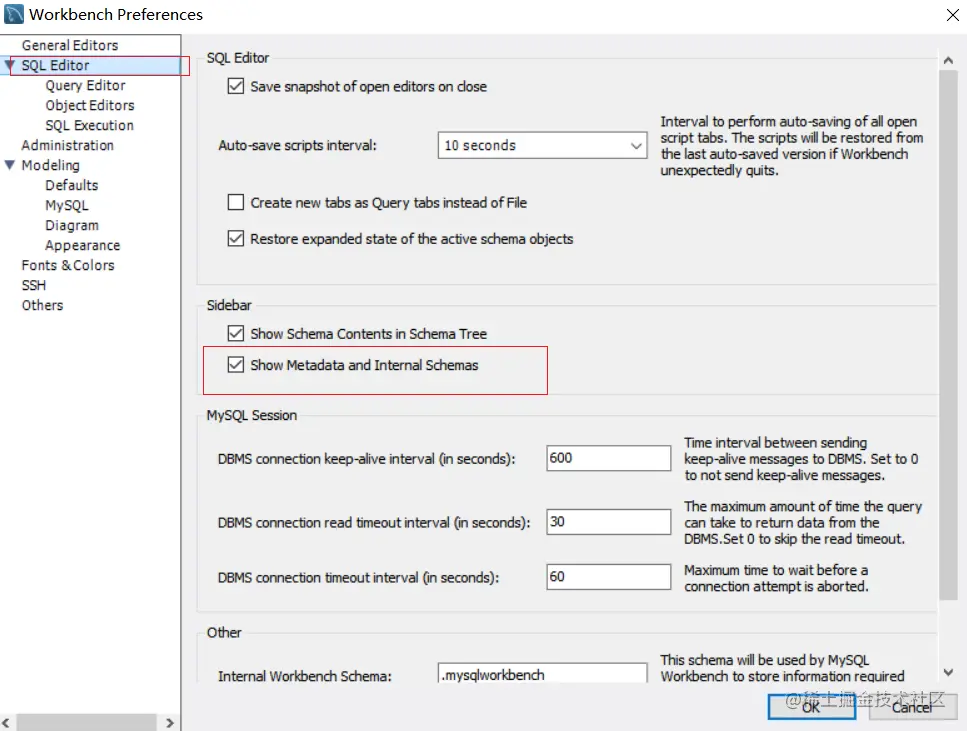 在选择SQL Editor 勾选 Show Metadata and Internal Sdhemas