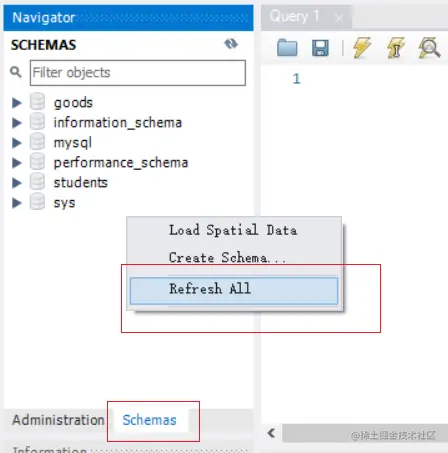 选中Schemas 并右键选择Refresh All 刷新全部 即可显示数据库