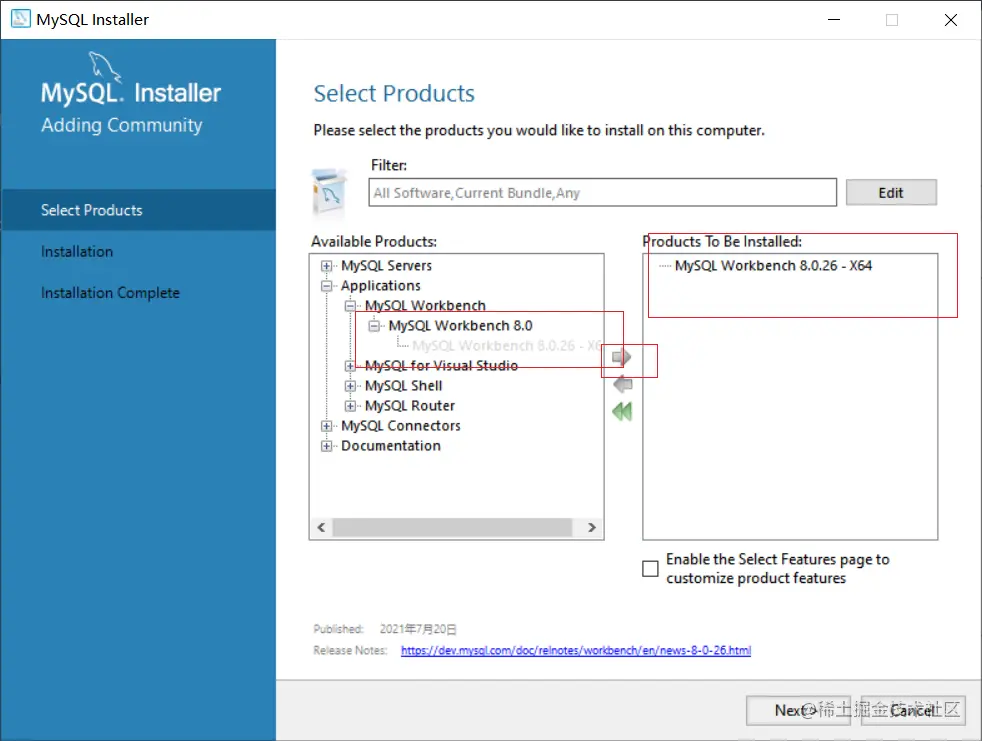 点击框中的右箭头把选中的MySQL Workbench导入到右边安装取