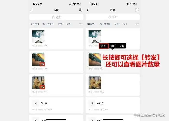如果照片有好几个类型或者你想把不同的照片发送给不同的好友,可以建立不同的收藏笔记,在收藏的目录中长按笔记点击【转发】来进行分享。 该页面中还可以看到笔记中图片的数量,更好区分不同的图片。