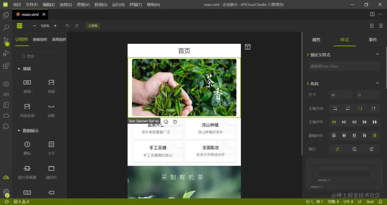 选择pages/main/main.stml页面文件,点击左上角的绿色图标,即可进入可视化工具界面。