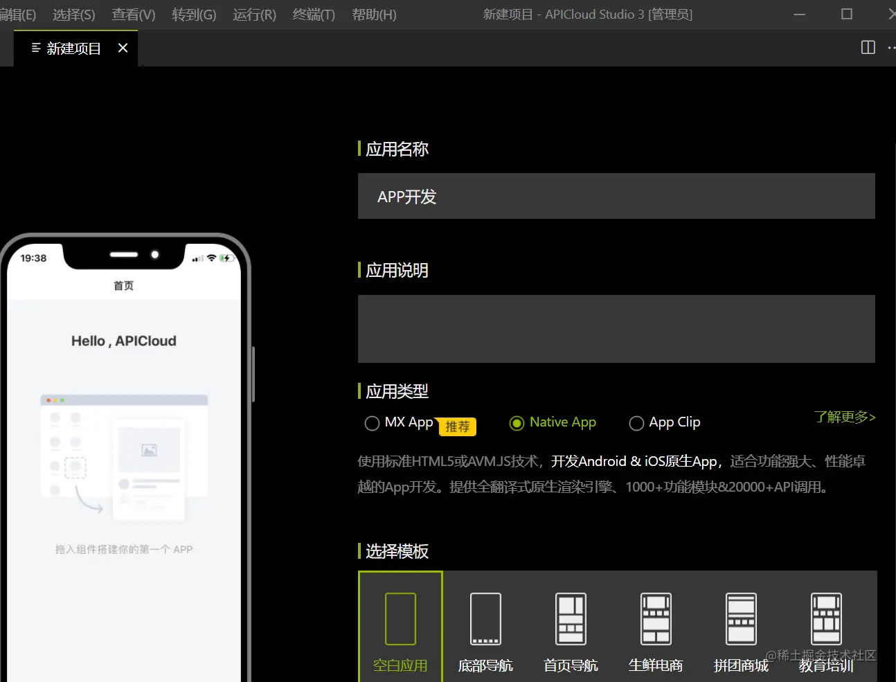 以上是完整的app开发过程,最近APICloud有可视化功能了,我尝试用可视化工具创建一个app。打开APICloud studio3,先创建一个项目。