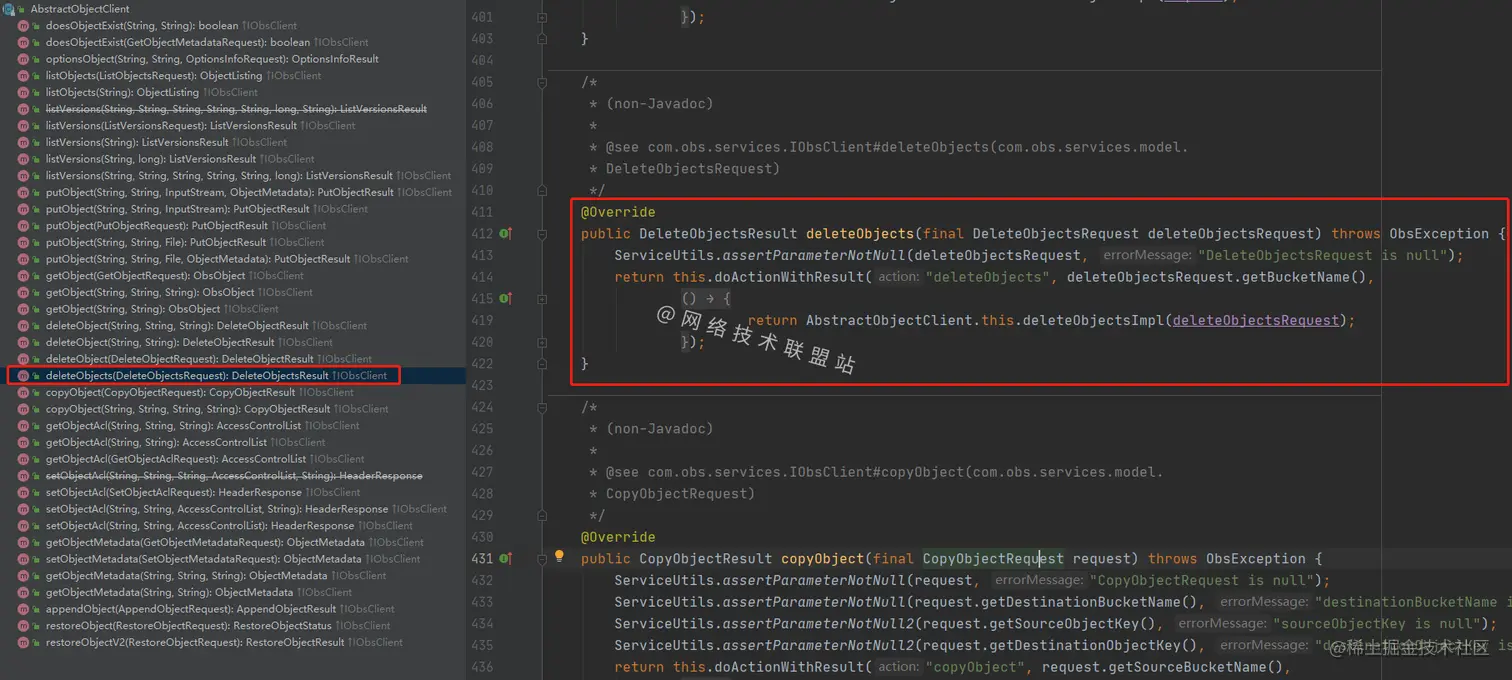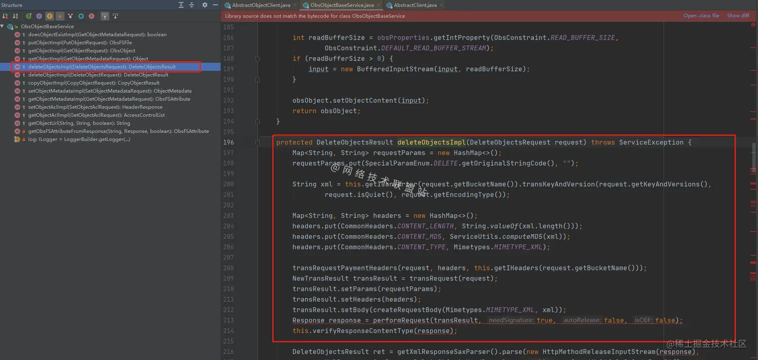 deleteObjects最终调用的是AbstractObjectClient.this.deleteObjectsImpl方法,也就是父类中的deleteObjectsImpl方法: