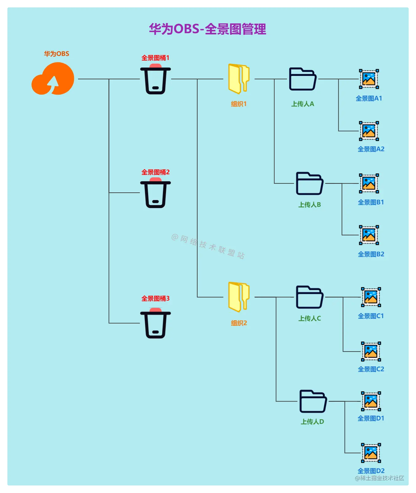 最近我涉及的一个项目就是用到了华为OBS作为对象存储,我们有个网站存储的是各类全景图,每张全景图上传到华为OBS后会通过全景图所属组织、上传人进行分类,也就是目录管理: