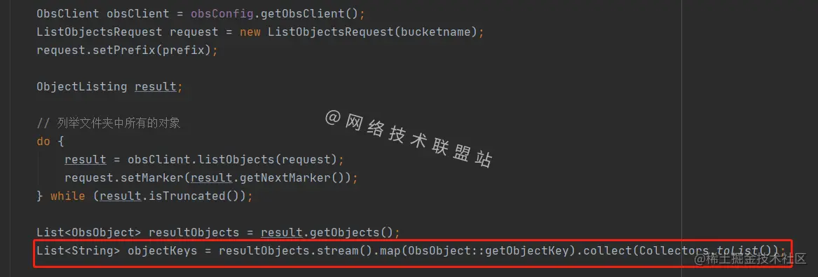 最后一行代码的意思就是将文件夹下所有对象信息中objectKey重新组装成一个新的list,这个list中都是objectKey。