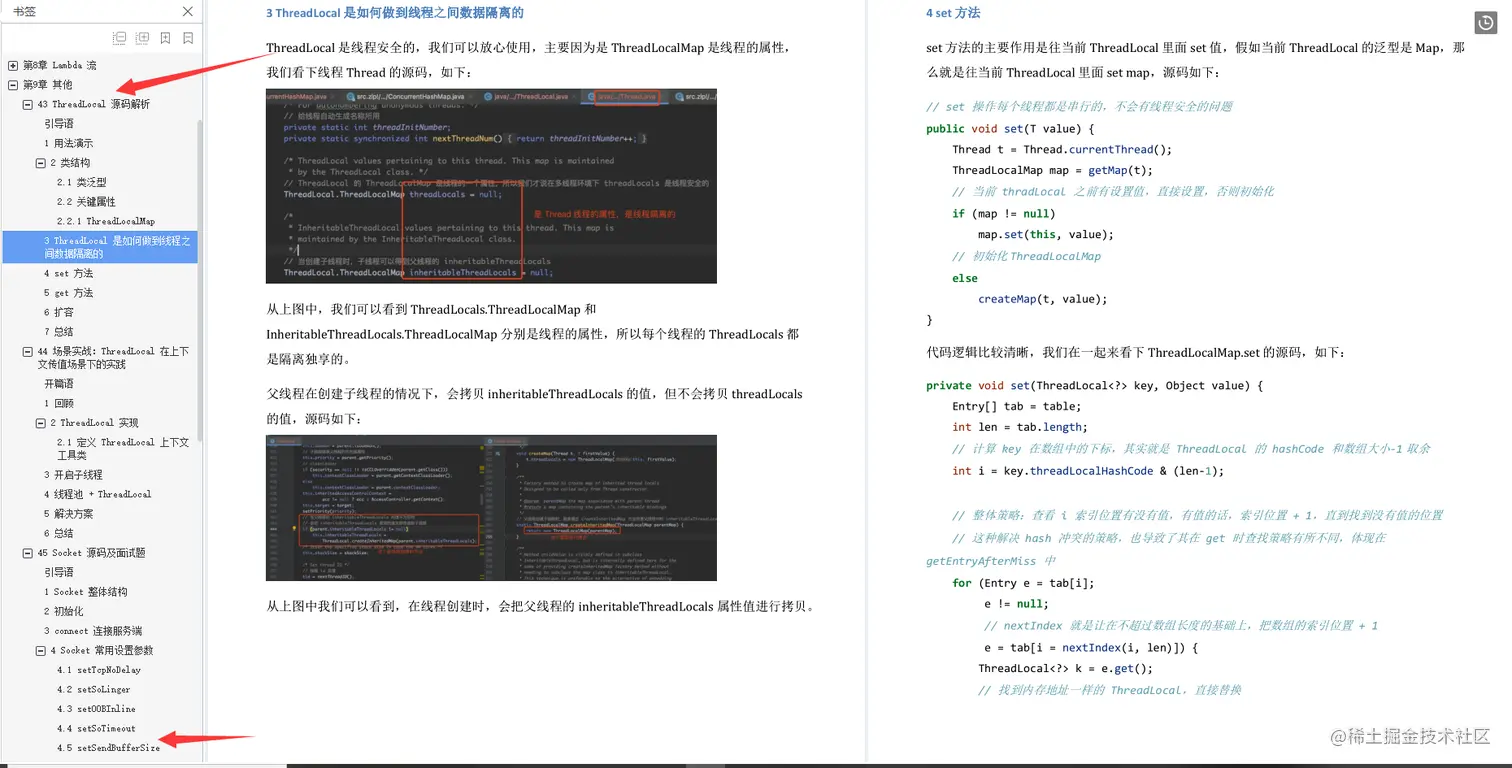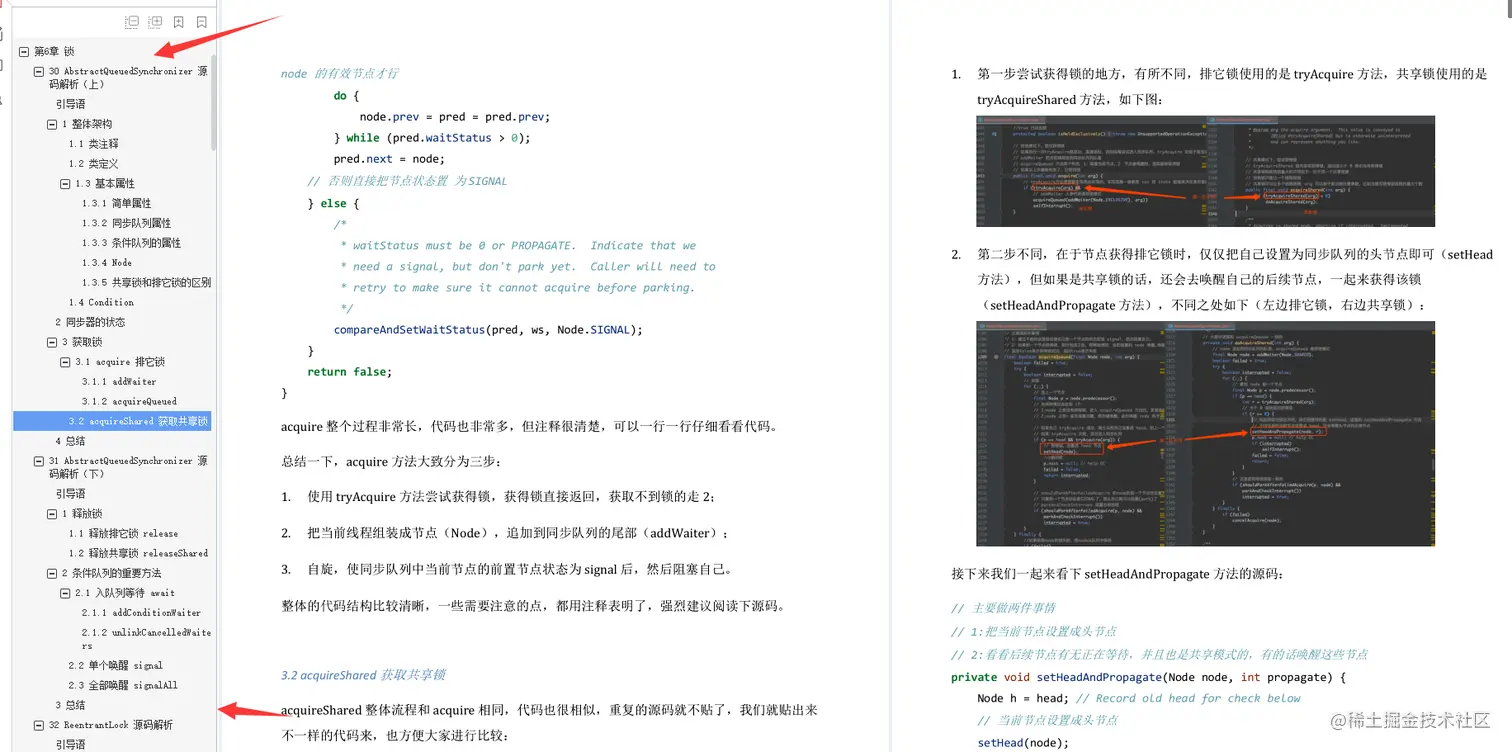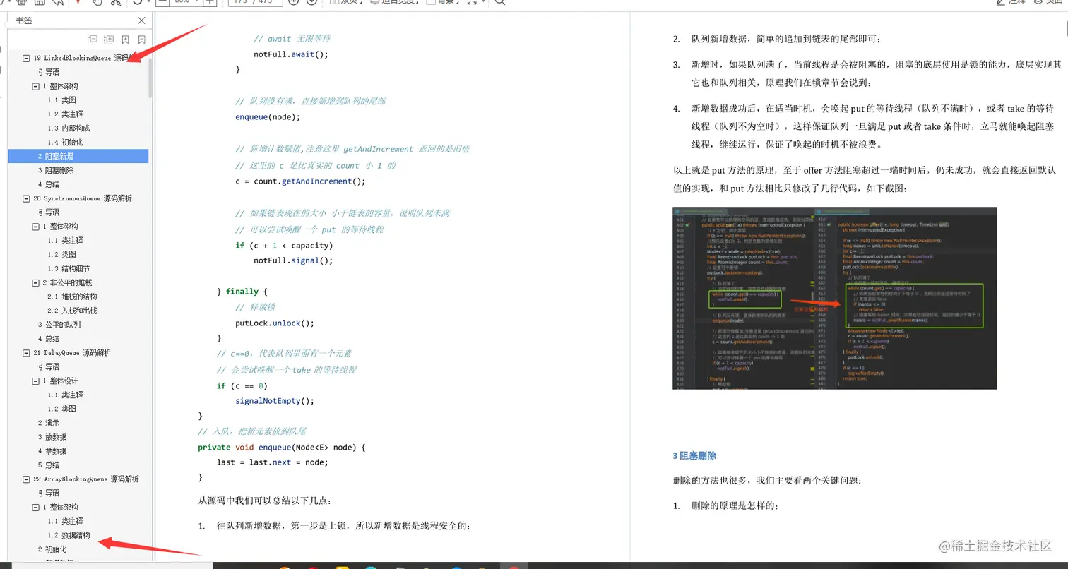 总结一下今天的内容。我先跟你探讨了“是读文档,还是读代码”,分析对比了从文档和代码中各自能收获到哪些东西,然后给出建议,如果想了解思想、方法和原理,读书和读文档会更有效率;如果想知道具体细节,还是应该读代码。下面我会分享一份我阅读代码和源代码时候的发现的一份面试官系统精讲Java源码及大厂真题文档, 按上面的说的技巧和方法去阅读这份文档你会有不一样的收获!