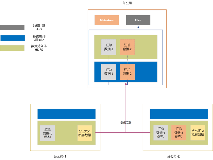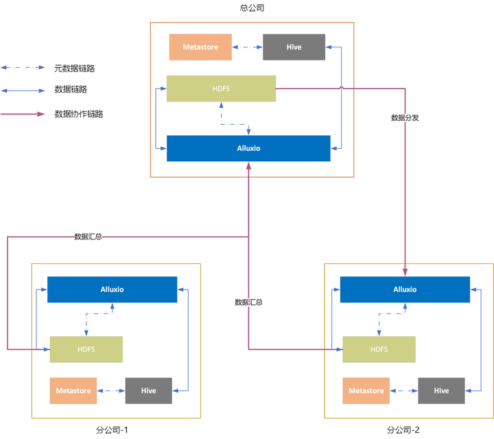 使用HDFS、Hive、Alluxio定义数据持久化与数据访问链路。在总公司和分公司构建统一的技术栈(技术标准),实现数据共享闭环: