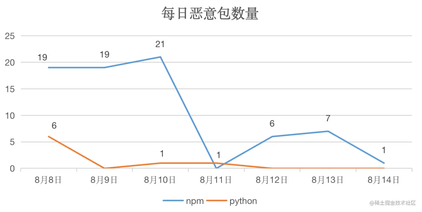 OSCS针对 NPM、Python 仓库监测的恶意组件数量如下所示,平均每天监控发现11个恶意包,其中 NPM 仓库仍旧是主要投毒对象,Python 仓库恶意组件数量相比之前有所下降。