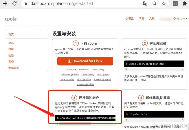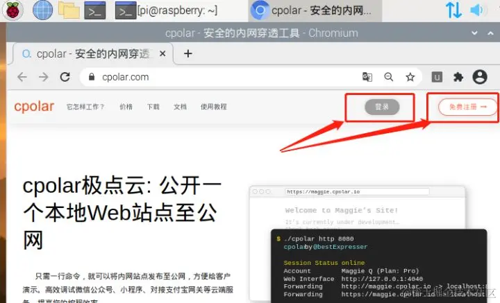 在树莓派上的cpolar安装成功后,我们就需要激活本地的cpolar客户端,即登录cpolar官网并进行简单注册后,取得唯一的cpolar口令码(只有进行注册,并以专属的口令码识别客户端,才能有效识别不同用户的隧道)