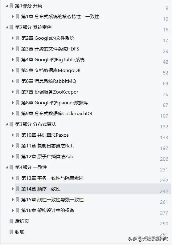 本文总共分为四大部分:开篇、系统案例、分布式算法、一致性;同时又把这四大部分化为16个章节,这16个章节里面又有更加细化的内容相信大家已经从上面的目录中可以看到!