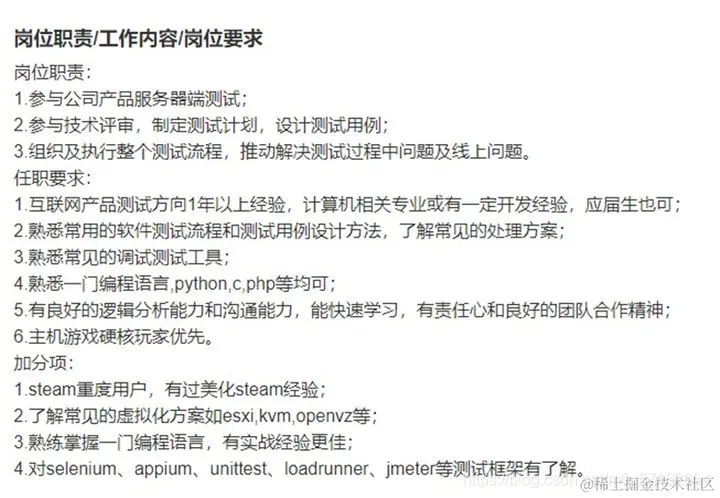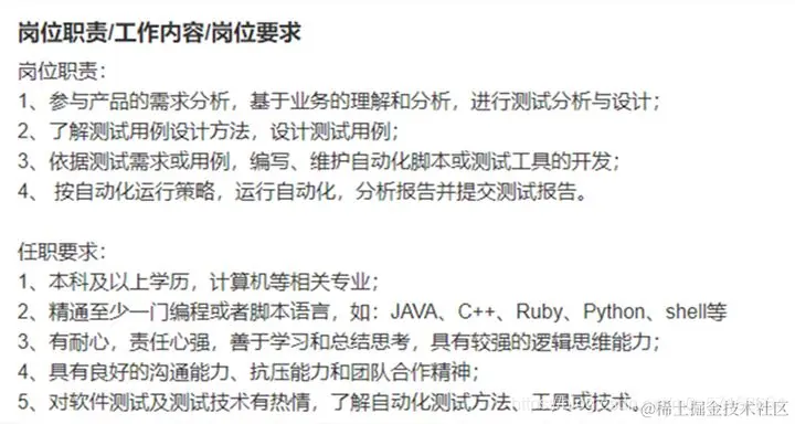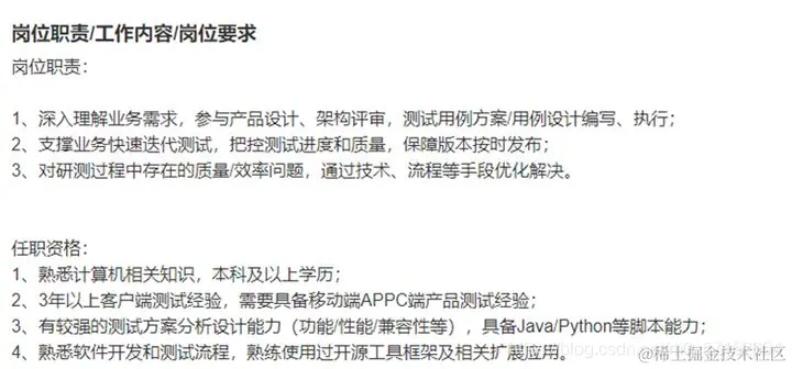 测试开发岗位的工作职责范围在不同行业、公司之间肯定会有不同,可以参考招聘平台的职责描述。如下图: