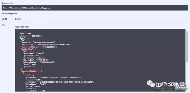 - 在Swagger中调用接口测试下,可以发现Member和Order中的属性已经被映射到MemberOrderDto中去了。