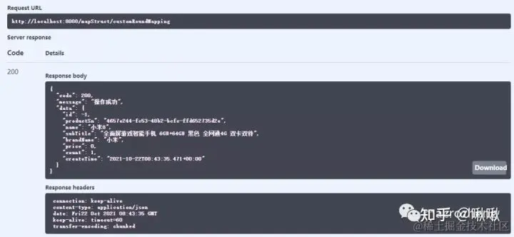 /** * MapStruct对象转换测试Controller * Created by macro on 2021/10/21. */@RestController@Api(tags = "MapStructController", description = "MapStruct对象转换测试")@RequestMapping("/mapStruct")public class MapStructController { @ApiOperation(value = "子对象映射") @GetMapping("/subMapping") public CommonResult subMapping() { List<Order> orderList = getOrderList(); OrderDto orderDto = OrderMapper.INSTANCE.toDto(orderList.get(0)); return CommonResult.success(orderDto); }}