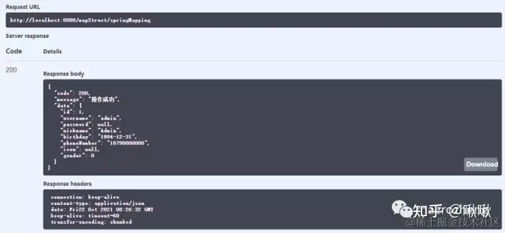/** * MapStruct对象转换测试Controller * Created by macro on 2021/10/21. */@RestController@Api(tags = "MapStructController", description = "MapStruct对象转换测试")@RequestMapping("/mapStruct")public class MapStructController { @Autowired private MemberSpringMapper memberSpringMapper; @ApiOperation(value = "使用依赖注入") @GetMapping("/springMapping") public CommonResult springMapping() { List<Member> memberList = LocalJsonUtil.getListFromJson("json/members.json", Member.class); MemberDto memberDto = memberSpringMapper.toDto(memberList.get(0)); return CommonResult.success(memberDto); }}