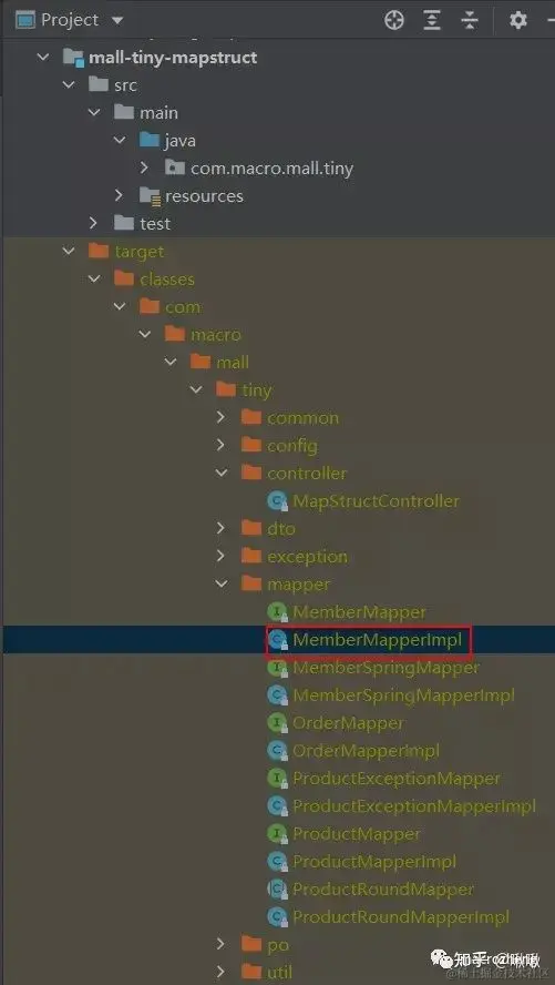 - 其实MapStruct的实现原理很简单,就是根据我们在Mapper接口中使用的@Mapper和@Mapping等注解,在运行时生成接口的实现类,我们可以打开项目的target目录看下;
