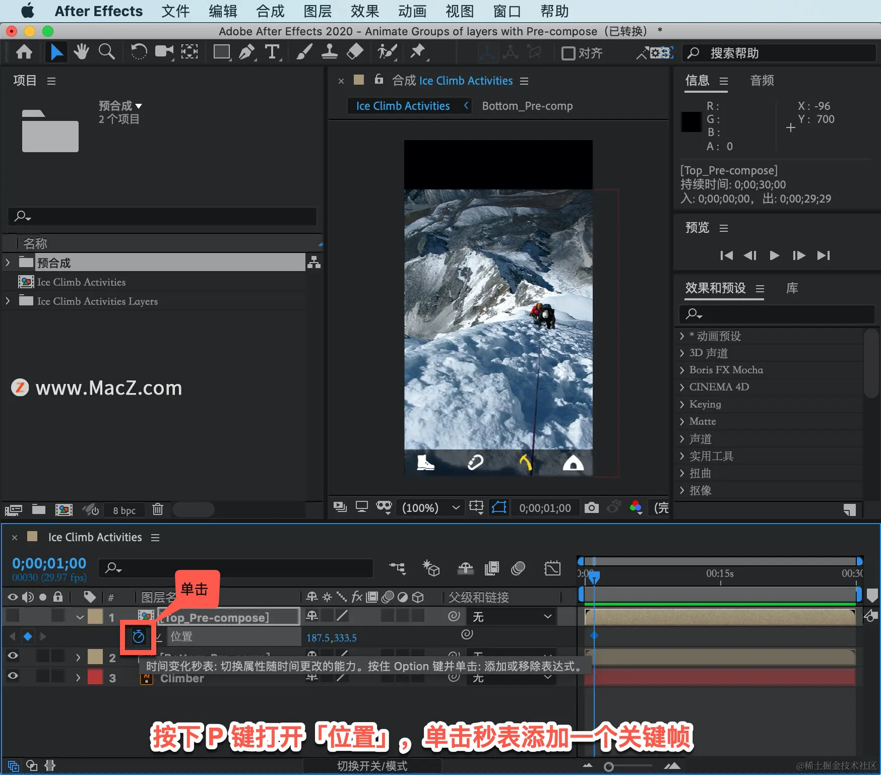 按下 P 键打开「位置」,单击秒表添加一个关键帧。